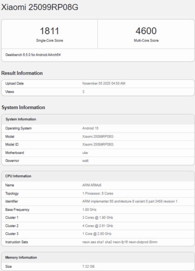 The Geekbench entry, identified by the model number 25099RP08G, reveals a Snapdragon 7+ Gen 3 chipset, paired with 8GB of RAM and Android 15 out of the box. That combination puts it squarely in the upper-mid segment, targeting users who want flagship-level performance without flagship prices.